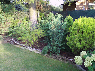 Der kleine Wald, den wir gestaltet haben, wird von Jahr zu Jahr immer schöner und verdeckt bald den unschönen Zaun. Wir freuen uns, daß trotz des Nadelbaumes die Pflanzen gut gedeihen. Die in unmittelbarer Nähe gepflanzt wurden werden von Mai bis September fast täglich gegossen.