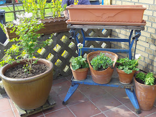 setzen. Nun sind in dem Blumenkasten Knollenbegonien, unser erster Versuch. Die unteren Töpfe haben wir mit weißen Geranien bepflanzt. Der mittlere, zerbrochene beherbergt Fetthenne, aus dem eigenen Garten und rechts hoffen wir auf eine reiche Blüte durch Männertreu. Der große Kübel, mit dem wir noch kein Glück hatten, bekam einen Flieder und in den nächsten Tagen ein Hornveilchen. Nun können wir uns nur die Daumen drücken, daß es gelingt.
